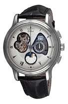 Find Zenith Men's 03.1260.4047/02.c505 Chronomaster Open Grande Date Moonphase Silver Barleycorn Guilloche Dial Watch Stainless steel case, transparent caseback, black alligator leather strap, triple-folding buckle, silver dial, partial skeleton dial showing the escapement mechanism, double date window between the 1 & 2 o'clock position, moon-phase indicator, small seconds-hand at 9 o’clock position, chronograph feature (seconds, minutes), anti-reflective sapphire crystal, swiss automatic movement,